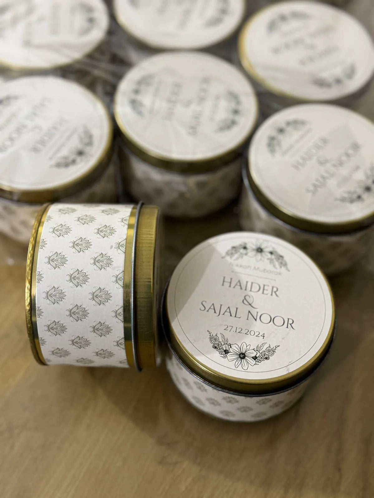 Specifications: Material: Good Quality Tin Material Size: 3 inches round 2 inches high Color: Gold Double Coated (Inside...