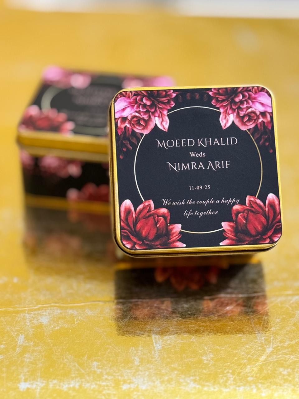 Specifications: Material: Good Quality Tin Material Size: 3x3x1.5 Color: Golden from outside and inside. Stickers: Customized stickers with your...